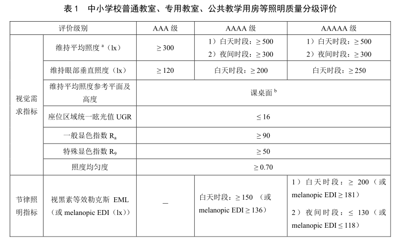 本標(biāo)準(zhǔn)在照明質(zhì)量分級評價(jià)中不僅規(guī)定了視覺需求指標(biāo),還規(guī)定了節(jié)律照明指標(biāo),還有照明系統(tǒng)要求與節(jié)能要求。